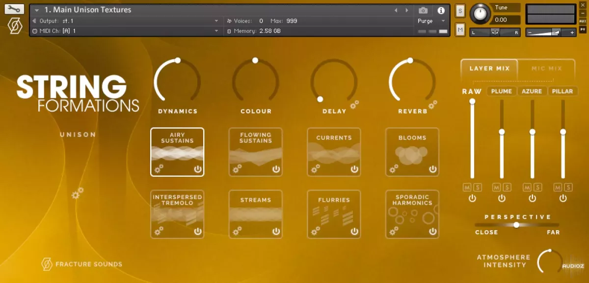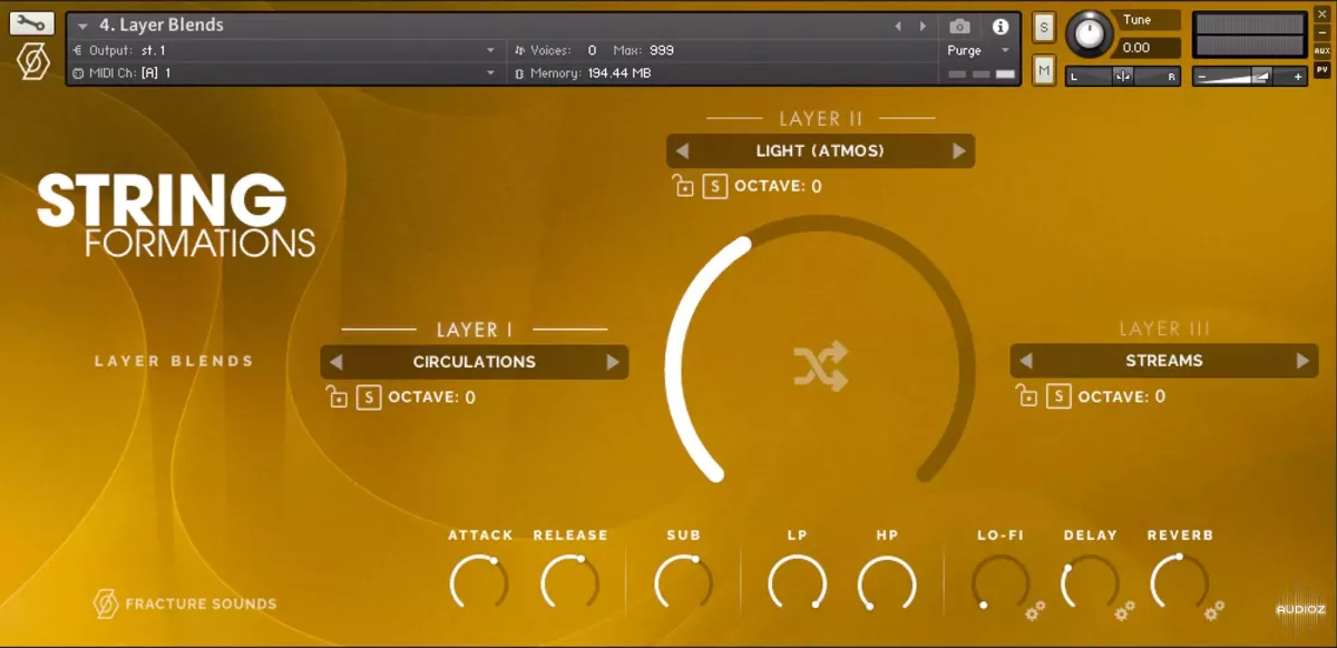 Continuing from Zen: Meditations and Trails, the Layer Blends in String Formations allows the blending of specific raw articulations and processed Atmosphere Layers from the Layer menu. With a total of 27 sounds and 17500+ possible blends, there is a wide range of sonic possibilities that can then be extended further with global effects such as envelopes, filtering, Lo-Fi effects, Delay, and Reverb.