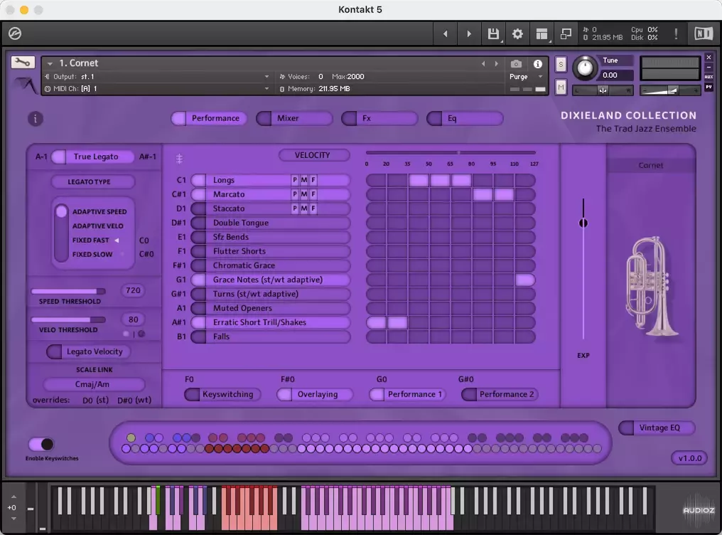 The Dixieland Collection is a laser- focused Trad Jazz ensemble of instruments designed to tap into the iconic sound of Jazz Giants like ‘Louis Armstrong and his Hot 7’ or ‘King Oliver’s Creole Jazz Band’ from the very birth of Jazz itself in the early 1900s – with every articulation performed to encapsulate everything from a strong live-performed ‘Satchmo’ style vibrato across all brass instruments, to idiomatic and highly nuanced inflections and performance techniques across the entire range. Including; Cornet, Clarinet, Trombone, Banjo (with live tempo sync’d strumming), Piano, Upright Bass and a Jazz Drum Kit (including iconic percussive elements).