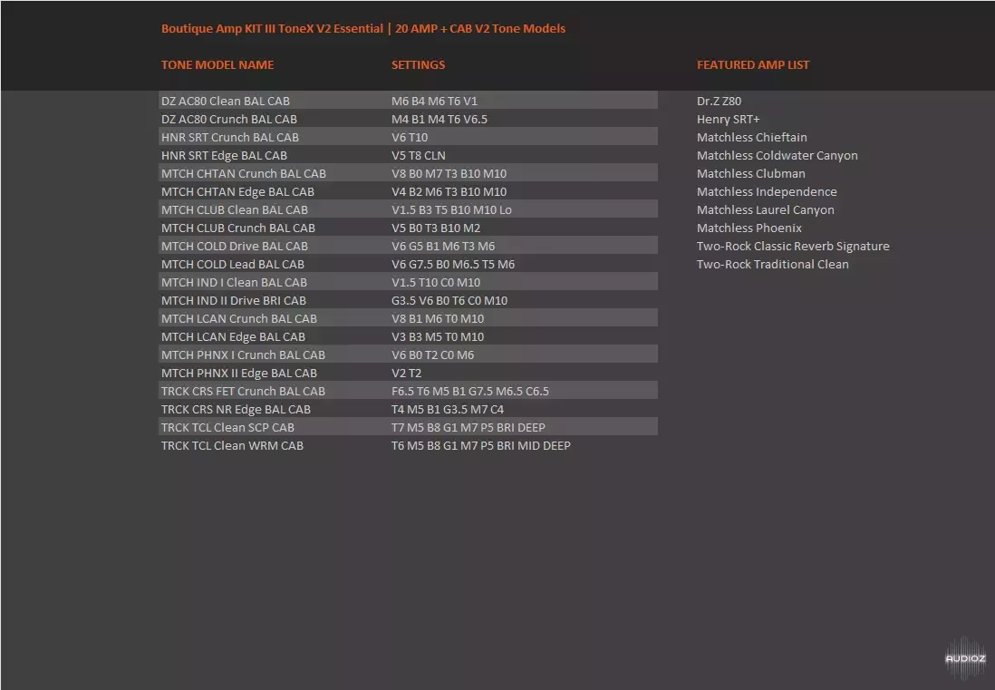 This boutique amp pack is focused mainly on captures based on Two-Rock and Matchless amps, but includes other highlights as well – this is the full line-up:
